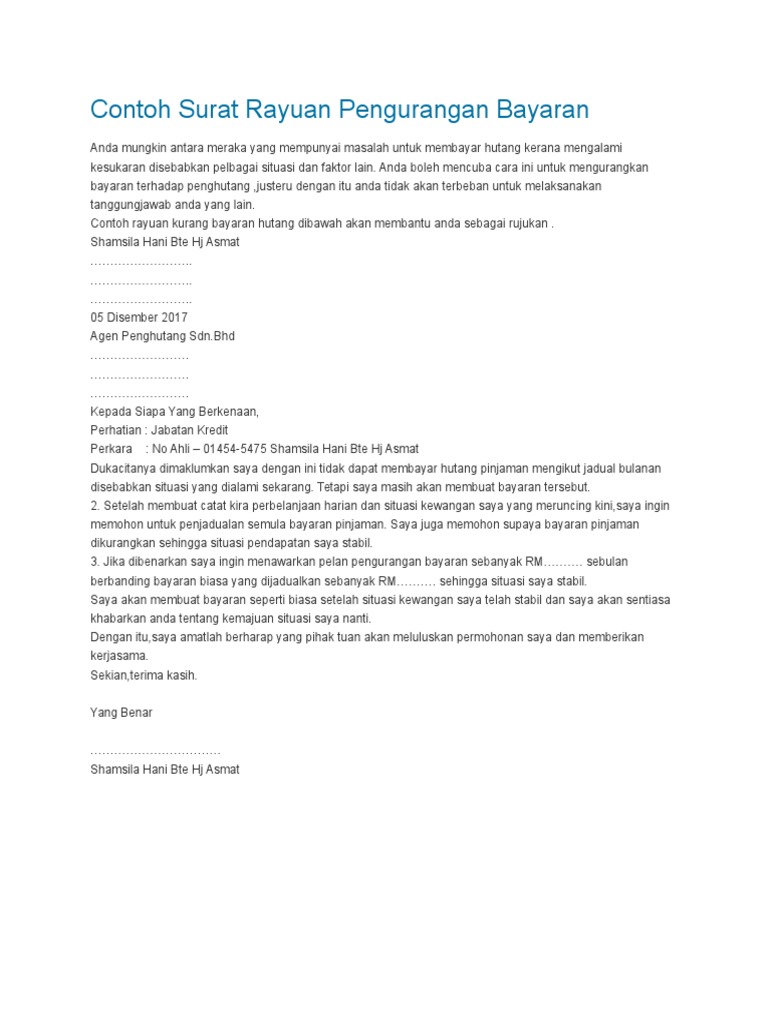 Contribute to listianiana8diraya development by creating an account on GitHub. Contoh surat pengurangan bayaran hutang ansuran. This document was uploaded by user and they confirmed that they have the permission to share it.